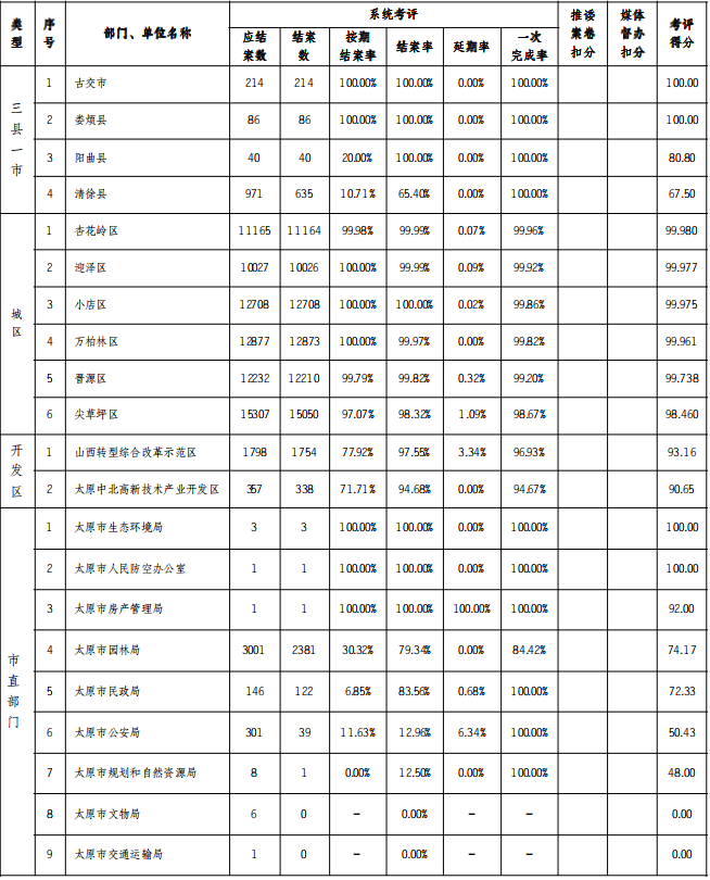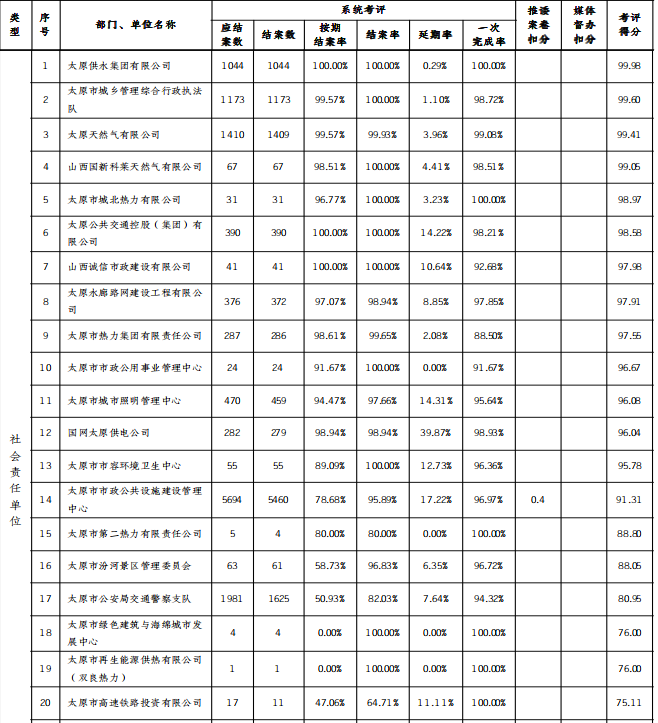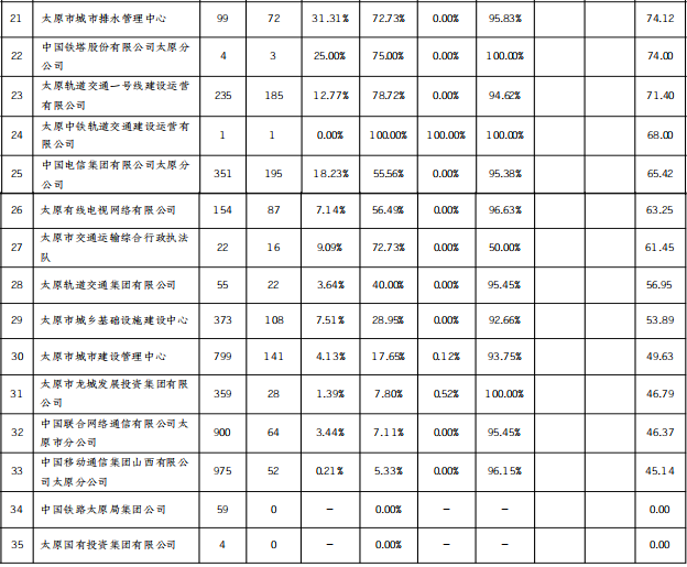 2.太原市水务局、太原市体育局(全民健身指导中心)、太原市发展和改革委员会、太原市商务局、太原市应急管理局、太原市市场监督管理局、太原市学生发展服务中心(太原市语言文字测试中心)、太原市市政公用工程质量安全站、太原市建设工程质量安全站、太原市消防救援支队、太原市黄河供水有限公司、太原日报社、山西日报社、晋原东区综合管廊建设管理有限公司未接到中心派遣案卷,故不参与本月考核。