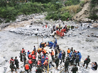 危急时刻,四川森林消防总队甘孜支队30名消防员踏着一条不到一脚掌宽的管道,一步步从河上挪到对岸。过河后,他们现场砍树制作了一座简易桥。随后,森林消防、武警、公安等救援力量通过这座简易桥展开了一场生命大救援。截至6日,青岗坪村300余名群众均已安全转移,其中包括29名重伤员。