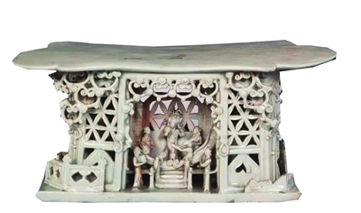 影青又称青白瓷,是宋代以景德镇窑为代表烧制的一种具有独特风格的瓷器,釉色介于青白二色之间,青中有白、白中显青。这件影青釉瓷枕造型别致、釉色月白、塑工精湛,集建筑与瓷塑艺术为一体,是元代青白瓷中的精品。