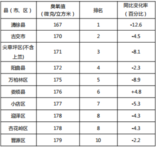 根据山西省太原生态环境监测中心数据,我市各县(市、区)2022年9月12日—9月18日臭氧污染由轻到重排名如下。