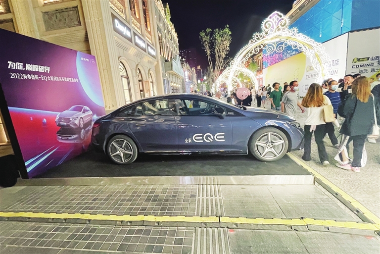 9月18日,省城钟楼街,一辆新款汽车当街展示,占用盲道,造成交通拥堵。邓寅明 摄