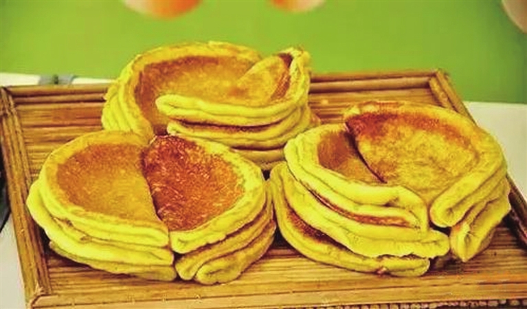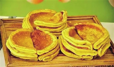“和(huo)”,又叫“折饼”,烙制时饼不翻身,饼的烙面在外,对折回来,内面自然粘连,形似半圆,既节省存放空间,又防止了放置时饼与饼之间的粘连,更保留了外焦里嫩的良好口感,是晋西北黄土高原的一种传统面饼。而称“折饼”为“和”的传统,起源于静乐县。