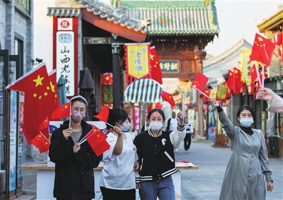9月29日,红旗飘扬、歌声嘹亮,一场“我和我的祖国”快闪活动在太原古县城举行,为国庆节增添了欢乐气氛。