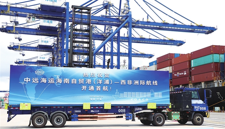 9月23日这一天,海南自贸港(洋浦)—西非洲际航线首航仪式在这里举行。随着一声汽笛长鸣,满载集装箱的轮船缓缓驶离码头,标志着海南首条通达非洲的集装箱航线正式开通。