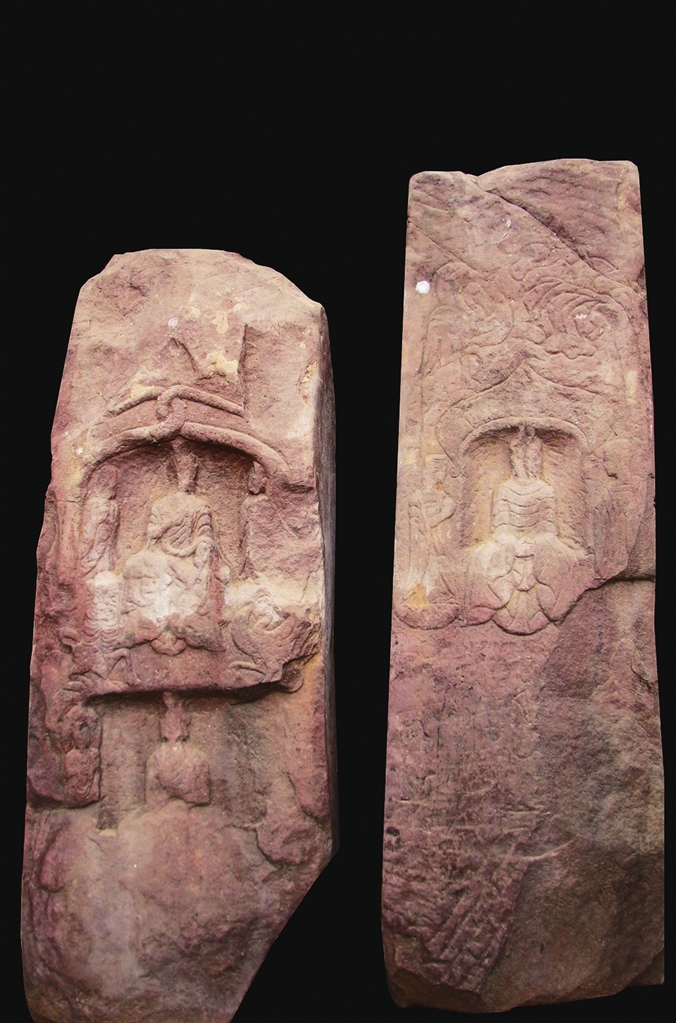 碑北侧圆拱龛内雕一坐佛,龛外左右雕二弟子。佛结跏趺坐,着通肩式袈裟,裙摆斜向两侧,呈八字形,用平直刀法雕刻。
