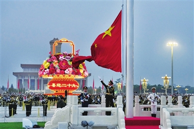 人民英雄纪念碑以北,是高达18米的“祝福祖国”巨型花果篮。篮体南侧书写“祝福祖国”“1949-2022”字样,北侧书写“喜迎二十大”字样。21.8万名群众簇拥在广场及周围,静待五星红旗升起。