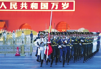6时05分,天安门城楼下,护旗编队铿锵行进。