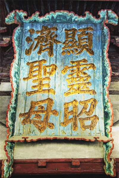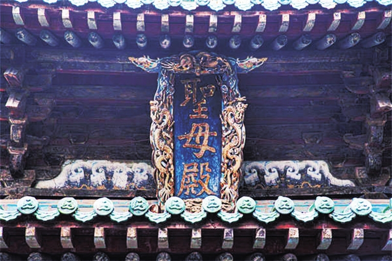 在圣母殿前廊正中悬挂的匾额“显灵昭济圣母”,立匾加饰白云朵式花边,是北宋原物。据《宋会要》记载:“熙宁十年(1077)封‘昭济圣母’,政和元年(1111)加封‘显灵昭济圣母’。”