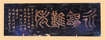 前廊右侧的“永锡难老”一匾为篆书,山西祁县晋商渠家渠本翘于光绪十五年(1889)撰并书。“永锡难老”语出《诗经·鲁颂》,“锡”通“赐”,意即永远赐予青春长驻,这里有祈求、赞颂晋泉永流不息之意。该匾采用阴刻、弧形、贴金的手法,由于光线与视觉的反差,当人们凝视时,字体一会儿凸出、一会儿凹进,十分有趣,人称“活字匾”。