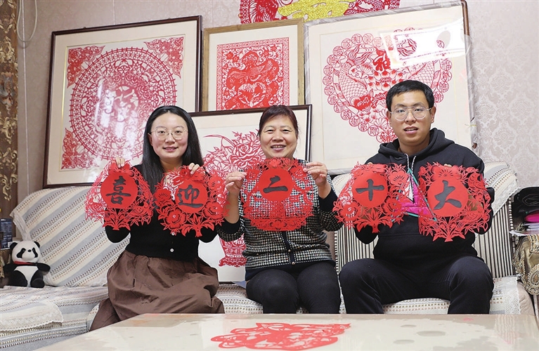 在党的二十大即将胜利召开之际,10月13日,国家级非物质文化遗产太原剪纸传承人任清香(中)创作了“喜迎二十大”主题剪纸作品,表达对党的热爱之情。张昊宇 摄