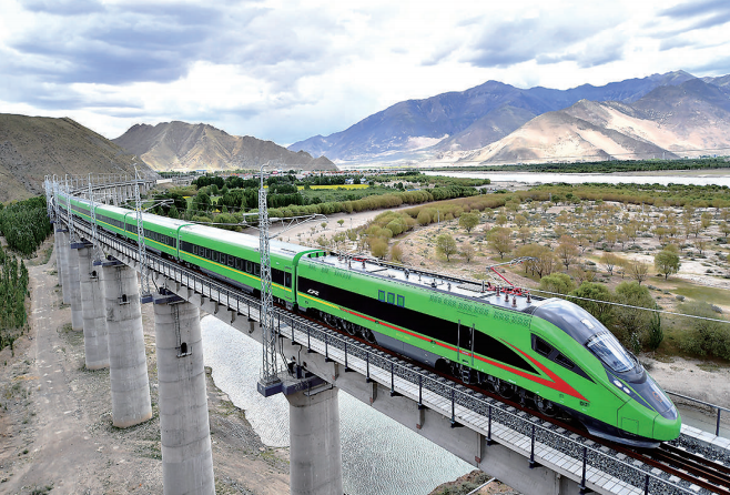 2021年6月25日,全长435公里、设计时速160公里的拉林铁路建成通车,西藏首条电气化铁路建成,同时复兴号实现对31个省区市全覆盖。这是试运行的复兴号列车行驶在西藏山南市境内(2021年6月16日摄)。 新华社记者 觉 果 摄
