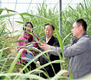 菌草专家林占熺(中)在宁夏银川市永宁县闽宁镇农户刘昌富的大棚里查看菌草生长情况(2021年3月29日摄)。 新华社记者 王 鹏 摄