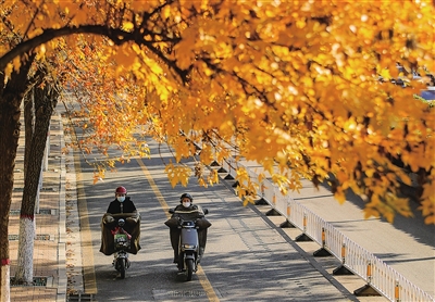 10月19日,滨河东路,行人在充满秋意的黄叶间穿行,成为一道独特的风景。王韵菲 摄