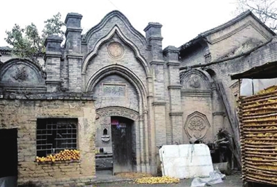 西边三东家曹生香的门楼是一种砖木结构带影壁的门楼,西洋式的尖形门壁上装饰有圆型砖雕饰件。在各种造型衬托下,高大的门楼巍然挺立,门额处最上部为圆形砖雕八卦;中间是长方框,内题“平为福”三个阴刻大字,垂花门罩砖雕朵朵莲花,隐喻“步步生莲,子孙满堂”之意。为增强大门气势,两旁修建了与门平行相接的“一字影壁”,影壁上饰有砖雕“富贵牡丹”“福寿连连”等图形,西式建筑样式和中式砖雕图案结合,和谐而统一。