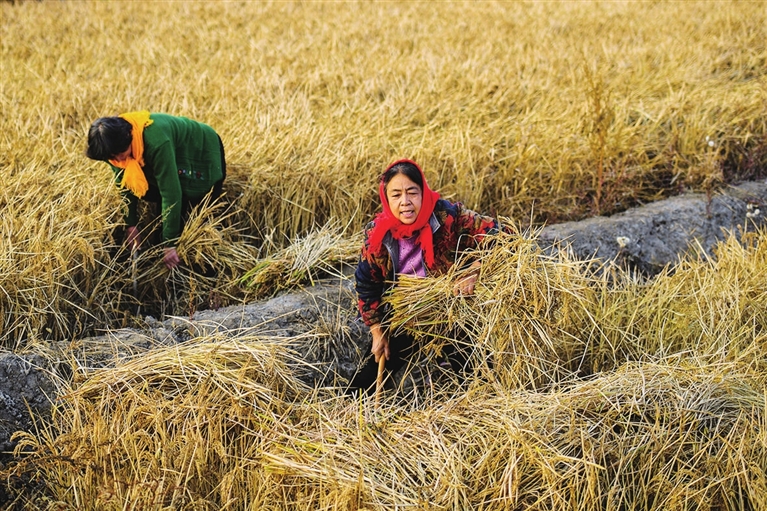 10月27日,晋源区索村,一垄垄稻田金黄成片,沉甸甸的稻穗迎风摇曳,村民正在收割水稻,一派丰收景象。