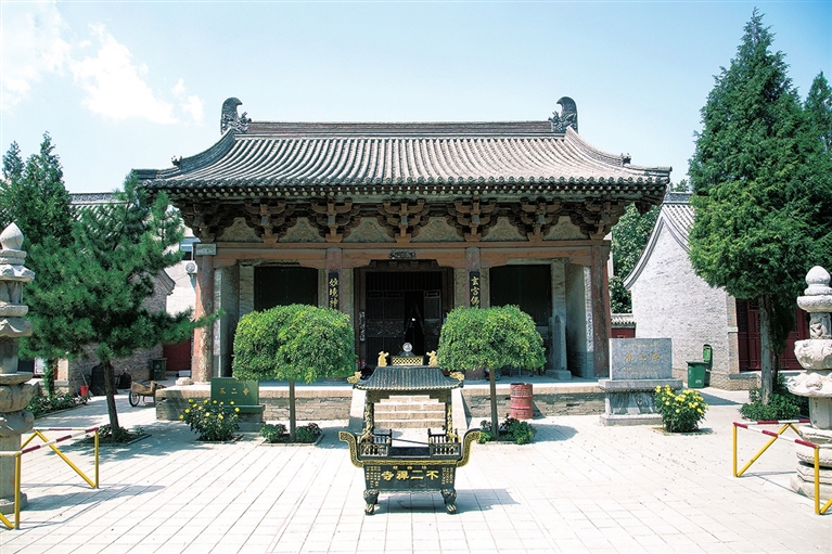 大殿前廊两侧存有元至元三十年(1293)、清康熙十年(1671)、清雍正二年(1724)、清乾隆六年(1741)石碑各一通。据雍正二年碑文记载,不二寺有“正殿一、东西殿二、天王殿一”,是一座重院的古老刹院。 大殿前东西两侧立有明洪武年间雕造的佛像线刻石幢和金代幢式灵塔各一座。