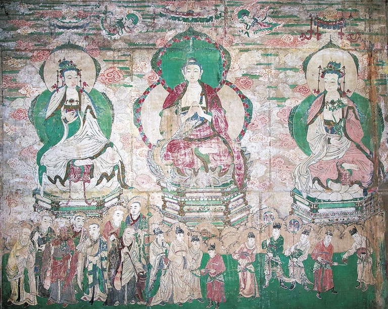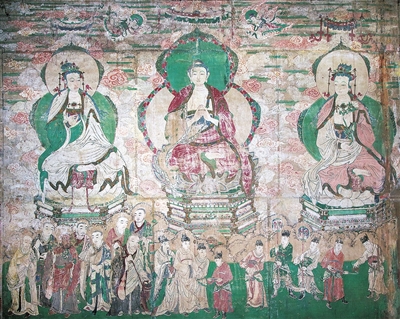 东西山墙存壁画约80平方米,每面山墙又分上、中、下三层,各层之间以云层相隔。上层均绘手持灵芝的吉祥飞天,在彩云缭绕中飞动。东面山墙中层绘东方三圣,主佛为药师佛,左右分别为日光菩萨和月光菩萨。下层绘十二药叉神将,下层中间绘民间舞狮图,威猛的狮子随着舞狮人的动作侧头起步,翩翩起舞。西面山墙中层绘阿弥陀佛,左右分别为大势至菩萨和观世音菩萨,又称西方三圣。下层左右两侧绘十六罗汉,下层中间稍低部位绘礼佛图,与东面山墙所绘的民间舞狮图情景相互呼应,构成一幅欢乐祥和、国泰民安的画卷,工笔细腻,线条流畅,反映出画工高超的技艺。