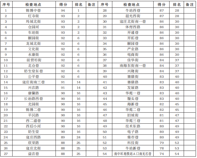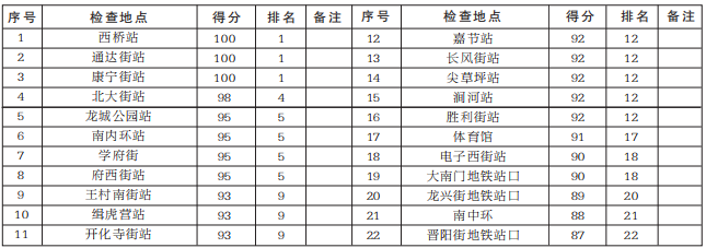 10月10日至10月14日,市创城办检查组人员对地铁2号线22个车站(共有23个车站,其中华章街车站未开)及周边54条背街小巷、51个生活小区进行了检查。
