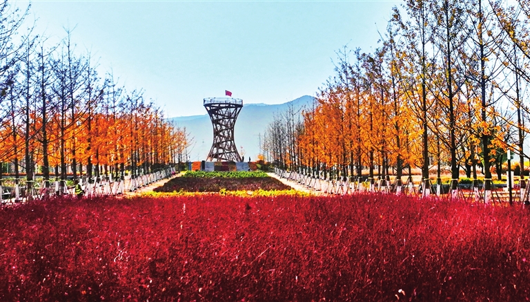 汽车行驶在西山旅游公路,山间略显寂静,平整的彩色旅游公路带来良好行车体验,李女士和小伙伴尽情欣赏着窗外风景。随着公路起伏,在山峦环抱的山坳里、沟谷中、山脊上,一片片一丛丛,或红或绿,或黄或橙的层层红叶,犹如红色浪涛,以排山倒海之势涌来,闯入视野范围。景中有路,路中有景。诗人元好问诗曰:“水上西山如挂屏,郁郁苍苍三十里”的青山美景,就这样铺陈在了眼前。在西山万亩生态园里,彩色林木与如茵草地组合,形成颇有意趣的休闲场地,李女士和姐妹们来这里分分钟拍出了大片。