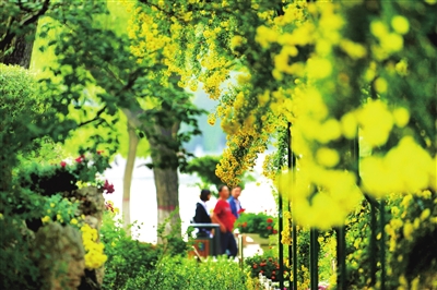 从公园的西门进入,一路南行可见海棠叶子变得棕黄,阳光映衬下,熠熠生辉、绚丽多彩。不远处的海棠亭,西府海棠、高原大海棠等各色海棠早已收敛清丽容姿,浅黄、深黄、棕黄的叶子仿佛在诉说着过去那场盛大的演出。海棠亭内,游园的人们徜徉其中,散步游乐,锻炼身体,享受一片宁静与和谐。