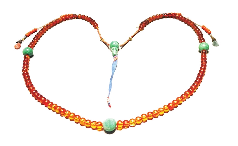 自汉代始,琥珀兽形饰通常与金、煤精、玛瑙、玻璃、水晶等制作的珠形、瓶形、胜形小配饰穿连成项链使用。清代就常常以金珀制作朝珠和冠珠,顺治帝后期,朝珠正式作为礼服的配饰进行佩戴。山西博物院所藏清代金珀朝珠,色彩鲜亮,高贵典雅,蕴含着特殊的历史意义。