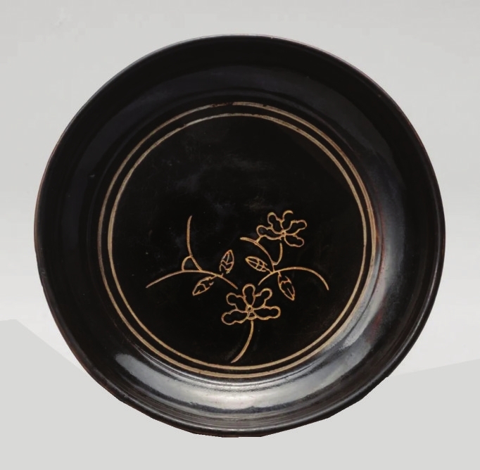 这件明代黑釉剔刻折枝花纹盘(右上图),绘带叶钩瓣桃花,嫩枝弯曲自如,叶片互生,叶筋历历。整个刻绘简约明快,落笔到位,代表了山西早期制瓷的水平。