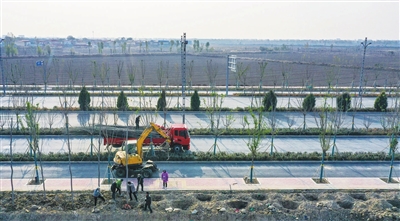 11月5日,滨河东路南延二期主体工程已经完工,施工人员正在进行道路绿化。韩双喜 摄