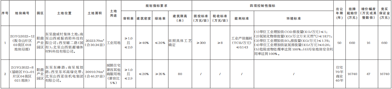 四、本次挂牌出让2宗地中,其中ZGYQ2022-12地块为“标准地”实行双合同一承诺管理,竞得人签订《国有建设用地使用权出让合同》时,须同时签订《“标准地”项目投资建设合同》,并自愿签署《企业投资工业项目“标准地”投资承诺书》。ZGYQ2022-8地块为现状出让,地上附着物产权明晰,于2023年2月27日前搬迁完毕。