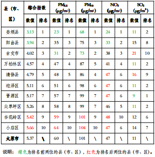 根据山西省太原生态环境监测中心数据,我市各县(市、区)2022年10月31日—11月6日全市及各县(市、区)PM2.5、PM10、NO2和SO2平均浓度通报如下。