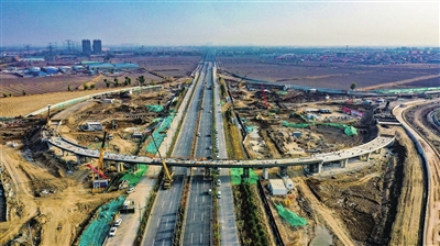 11月8日,小牛线西延一标段建设工地上,施工人员正在加紧施工。目前,该项目与滨河东路互通立交桥钢结构箱梁已吊装完毕。建成后,将畅通我市主城区至潇河产业园区的连接。韩双喜 摄