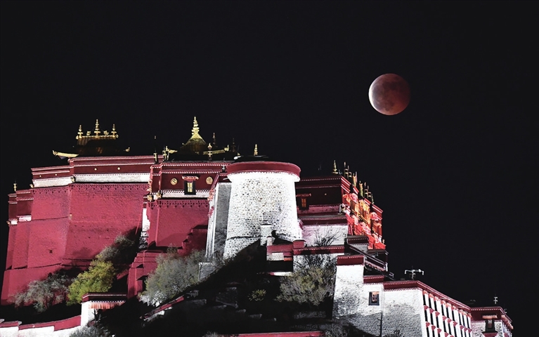 这是11月8日在拉萨拍摄的月食。11月8日,天宇上演月全食。这次月全食有两大特点:我国绝大部分地区都可以看到全食的“红月亮”阶段;全食阶段月球会遮掩太阳系八大行星之一的天王星。新华社记者 觉 果 摄