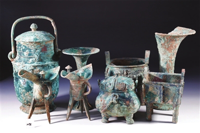 ▲邵家棚遗址墓葬出土的铜礼器组合(资料照片)。