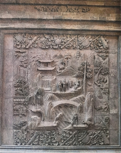 细看壁雕,山水、树木、塔桥、楼阁之间,有水边垂钓的渔夫、驱牛犁田劳作的农夫、担柴歇脚的樵夫、倚窗苦读的学子。他们表情自然、动作各异,巧妙地安排在壁雕画面的适当部位,人物自然地融入到山水、塔桥、楼阁之中。壁雕上下部的图案为道家“八宝”,分别是葫芦、扇子、宝剑、荷花、花篮、渔鼓、洞箫、玉板,即所谓的“暗八仙”。