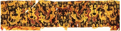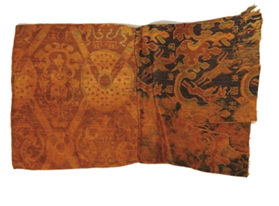 此件织锦袖子残件右侧织物较大,呈梯形,从其断口来看,原应为衣身部分;左侧较小,呈较为规则的长方形,应为袖口部分。这两件织物采用的就是平纹经重组织织造,其中“岁大孰”锦以深蓝色经线作地,棕红、绿、米白、黄等色经线显花,为1:4平纹经锦。同时,为了丰富图案,此件织锦还在局部织入了橙色经线,使织物表面产生雨丝效果。