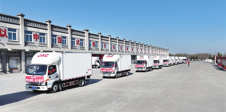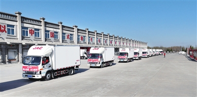 11月27日,太原六味斋实业有限公司食品工业园,满载配送食品的车辆将驶往市区400余个销售网点。疫情期间,该公司加大肉类、主食、豆制品等生活用品的配送力度,确保供应充足。宿晓健 摄