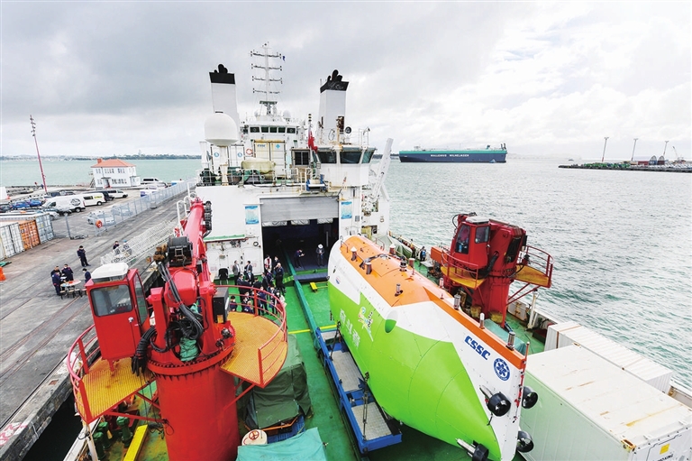 11月27日,中国“探索一号”科考船搭载着“奋斗者”号全海深载人潜水器停靠在新西兰奥克兰皇后码头。