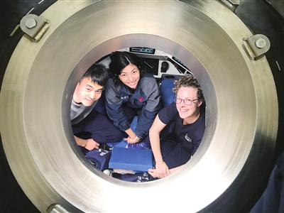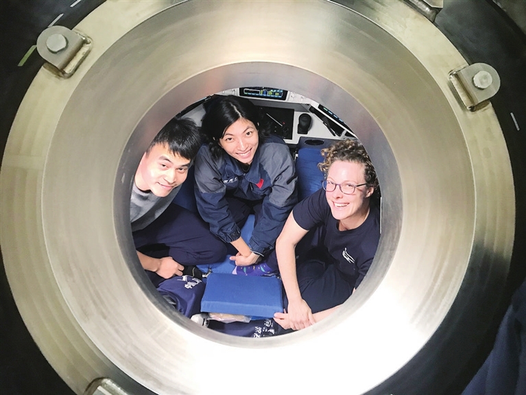 11月4日,在中国“探索一号”科考船上,中科院深海所潜航员邓玉清(中)、袁鑫(左)和新西兰国家水资源和大气研究所科研人员卡琳·施纳贝尔准备进行万米深潜。