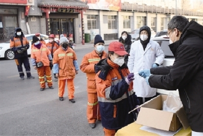 12月26日,山西广誉远中医研究院将研发的口罩内置药包向环卫工人免费发放,提高他们的防护能力。米国伟 摄