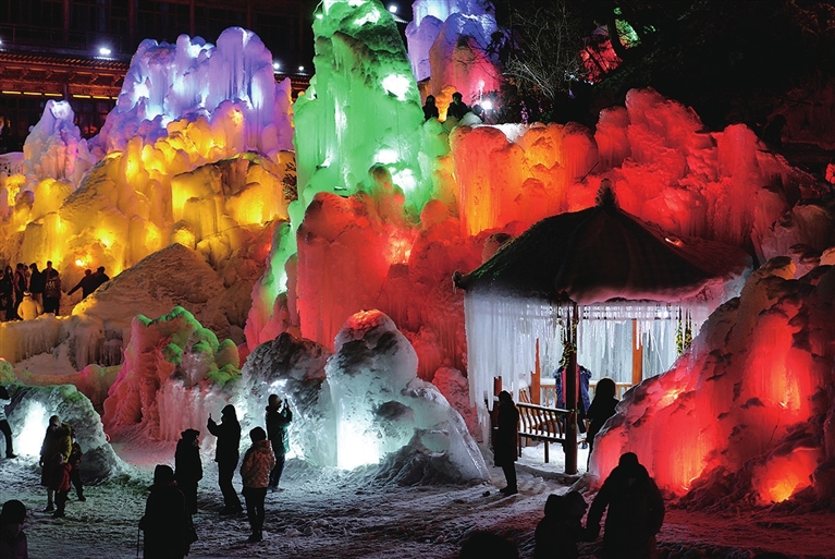 12月25日晚,游客在甘肃省大墩峡景区观赏冰瀑。