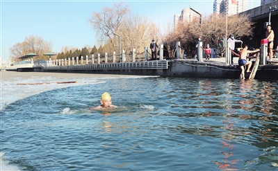12月29日,在汾河景区南内环桥段,众多冬泳爱好者不畏严寒,在冰冷的汾河中畅游,享受冬泳带来的乐趣。