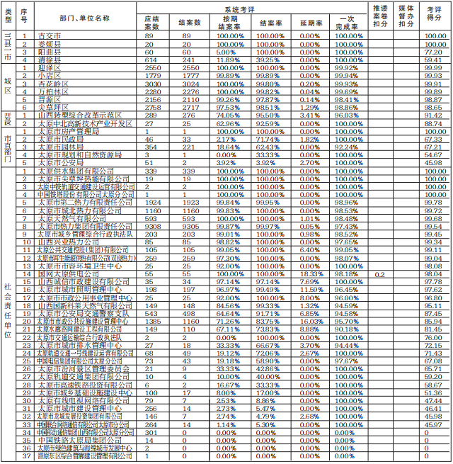 2.太原市交通运输局、太原市人民防空办公室、太原市体育局(全民健身指导中心)、太原市商务局、太原市应急管理局、太原市文物局、太原市水务局、太原市生态环境局、太原市市场监督管理局、太原国有投资集团有限公司、太原市学生发展服务中心(太原市语言文字测试中心)、太原市市政公用工程质量安全站、太原市建设工程质量安全站、太原市消防救援支队、太原市黄河供水有限公司、太原日报报业集团、山西日报社未接到中心派遣案卷,故不参与本月考核。