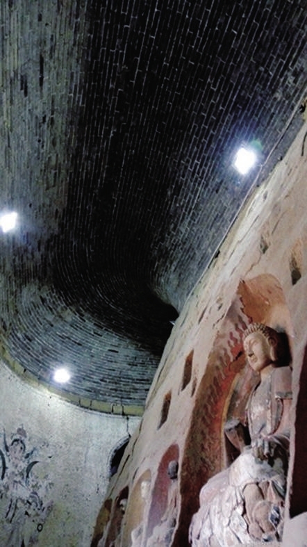 建于明代的这段拱券式廊屋,不仅保护了石刻、石窟和壁画,也给世人留下了全球绝无仅有的“悬蜗卧顶”特色建构。