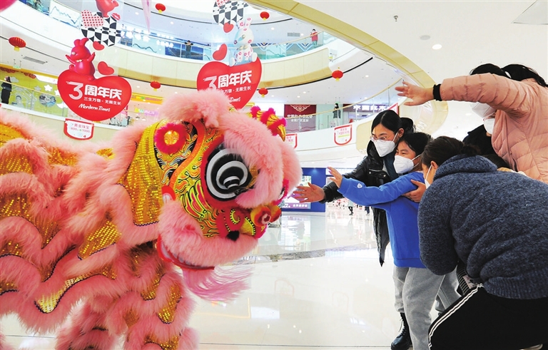 1月2日,家长带着孩子在山东省滕州市一家商场观看舞狮表演。
