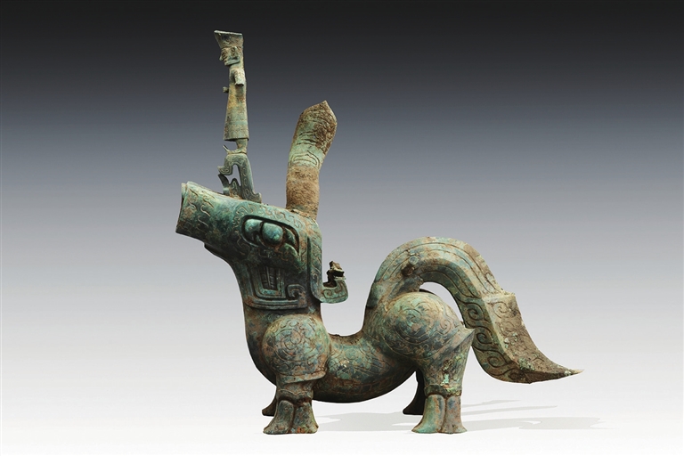 冉宏林告诉记者,8号“祭祀坑”神兽刚出土的时候,考古学家和文物保护专家通过仔细观察发现,神兽尾巴部分有两个凸起,其细节、尺寸与3号“祭祀坑”出土的铜顶尊跪坐人像相合。再结合1986年2号“祭祀坑”出土神坛上的神兽顶人、人顶尊的造型,判断这两件文物可以拼对在一起。