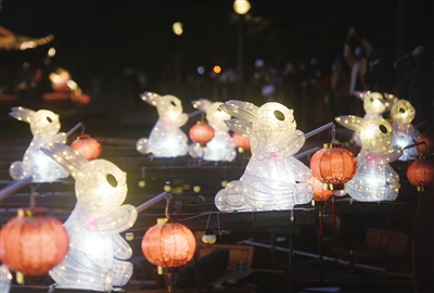1月11日,装有“玉兔灯”的人力手划船在杭州西湖停泊。随着农历癸卯兔年临近,日前,30艘装有“玉兔灯”的手划船集中亮相杭州西湖,供市民游客乘坐、赏灯游玩,热热闹闹迎接新春佳节。新华社发 (龙 巍 摄)