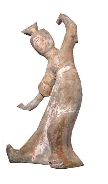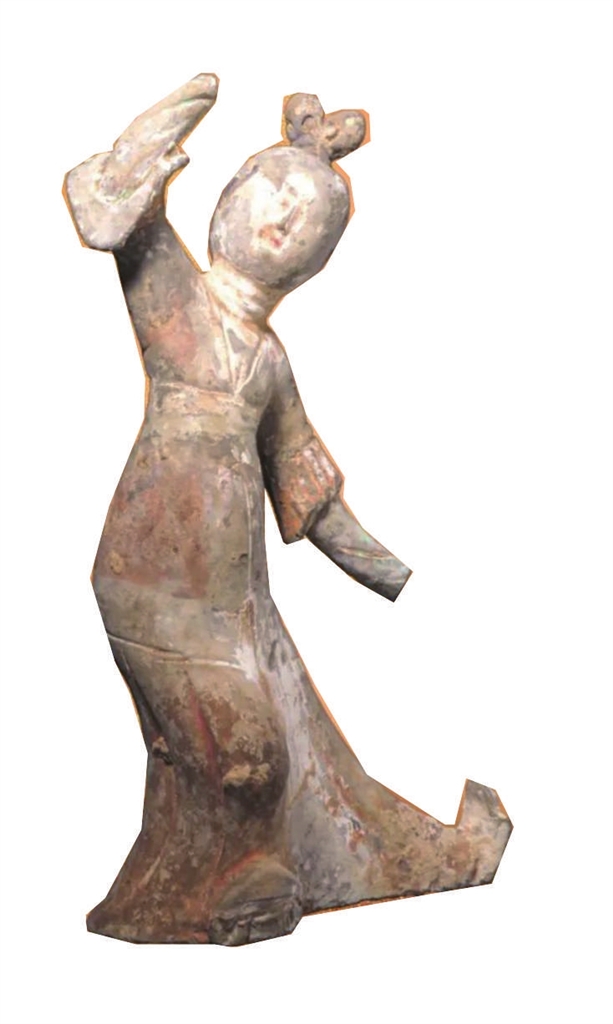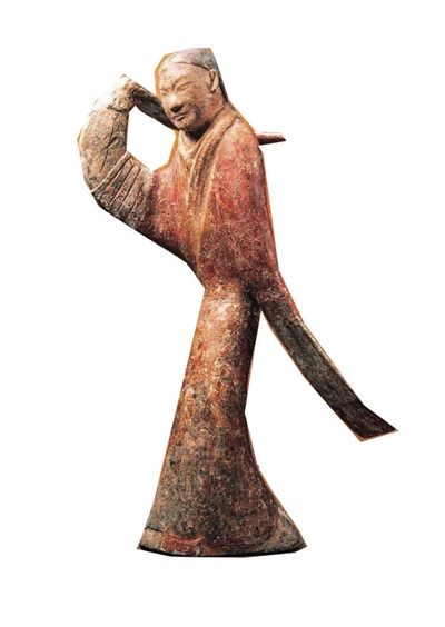西汉之时,人们已经非常重视过年,雍容典雅的汉乐舞成为当时庆贺新年的重要方式之一。中国国家博物馆珍藏的西汉彩绘长袖女舞俑,1954年出土于陕西省西安市白家口,彩绘陶舞俑雕塑高50厘米,作长袖舞动状。女俑长发中分,向后梳理垂背,颈后挽髻,发梢左垂,身穿交领右衽深衣,深衣褶袖内露长舞袖,面容清秀,流露清淡的笑意,成功塑造出形体舒展洒脱、精神恬静内敛的长袖舞伎形象。长袖舞是汉代著名的舞蹈。西汉时期,国家的统一、经济的繁荣、长期稳定的生活以及贵族、官吏的好尚,使乐舞艺术得到蓬勃发展,长袖舞就是当时所盛行的舞蹈种类之一。这件彩绘陶舞俑抓住了舞女舞动长袖的一刹那,把轻盈、舒展而柔美的长袖舞刻画得生动传神,是汉代雕塑艺术品中的杰作。