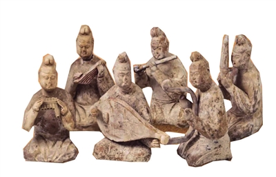 大唐宫廷中的歌舞也毫不逊色。唐代舞蹈与音乐在人们生活中占据相当重要的位置,不仅在节日庆典上有歌舞表演,富贵之家外出郊游也要带上伎乐。故宫博物院和中国国家博物馆珍藏的唐舞蹈陶俑、唐演奏陶俑,女舞俑上穿翻领半袖衫,下着长裙,束腰,头微侧,两臂一上举、一下垂,双腿一侧伸、一屈曲,腰肢轻扭,翩翩起舞;演奏陶俑分持琵琶、排箫等乐器,美妙的音乐、灵动的舞蹈呼之欲出,再现了长安守岁的盛况。