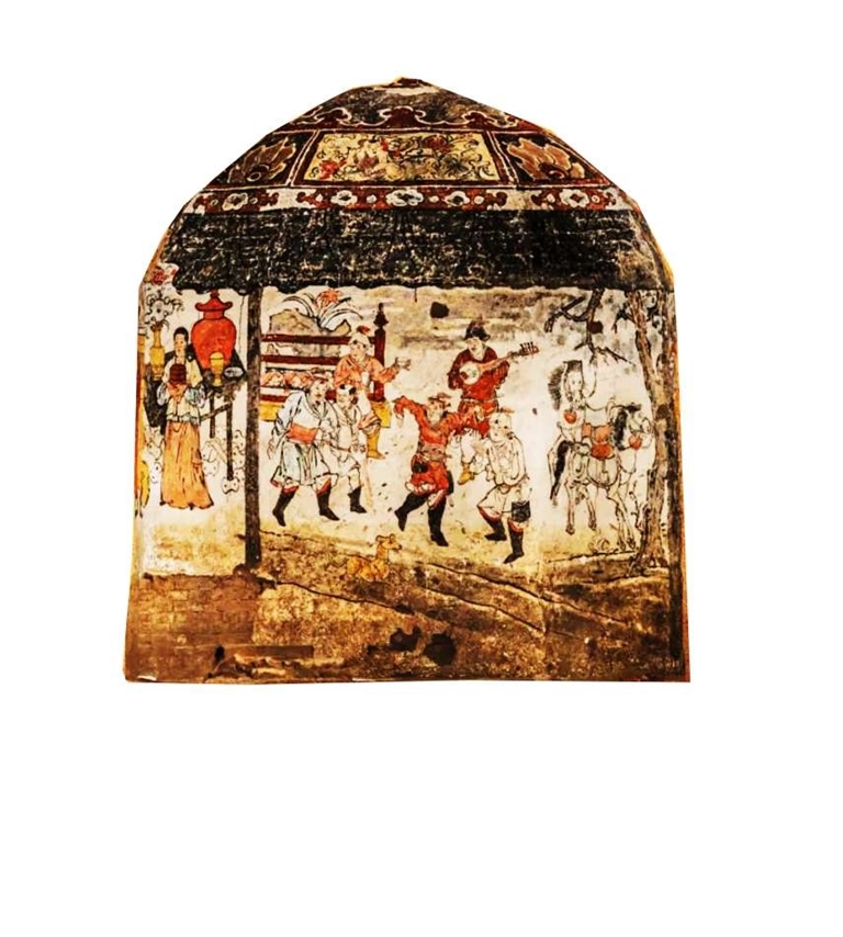 陕西省考古研究院珍藏的壁画《醉归乐舞图》则展现了元朝过年的歌舞盛况。醉态十足的主人在一小童的搀扶下缓步前行,另一童子还举着酒壶、酒盏。中间三人,一人弹奏四弦火不思,一人随乐起舞,一人击掌为节拍。右侧树下有鞍马两匹。画中的6个人都是蒙古装束,表现了主人出门畅饮后醉酒而归、随从乐舞相娱的热闹场面。
