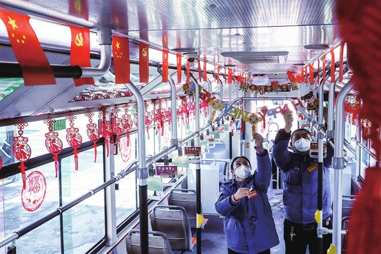 1月15日,在太原公交集团三公司松庄停车场内,司机师傅们正在精心布置车厢,营造出浓浓的节日氛围。