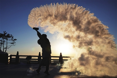 1月14日,在抚远市东极阁,游客在日出时玩“泼水成烟”。隆冬时节,“华夏东极”黑龙江省抚远市展现出特别的活力。游客在“东极”观日出,在市内赏美景;赫哲族群众进行冬捕和各项冬季传统民俗文化活动;当地居民在鱼市上忙着采购……“华夏东极”的冬日别有一番韵味。新华社记者 王建威 摄
